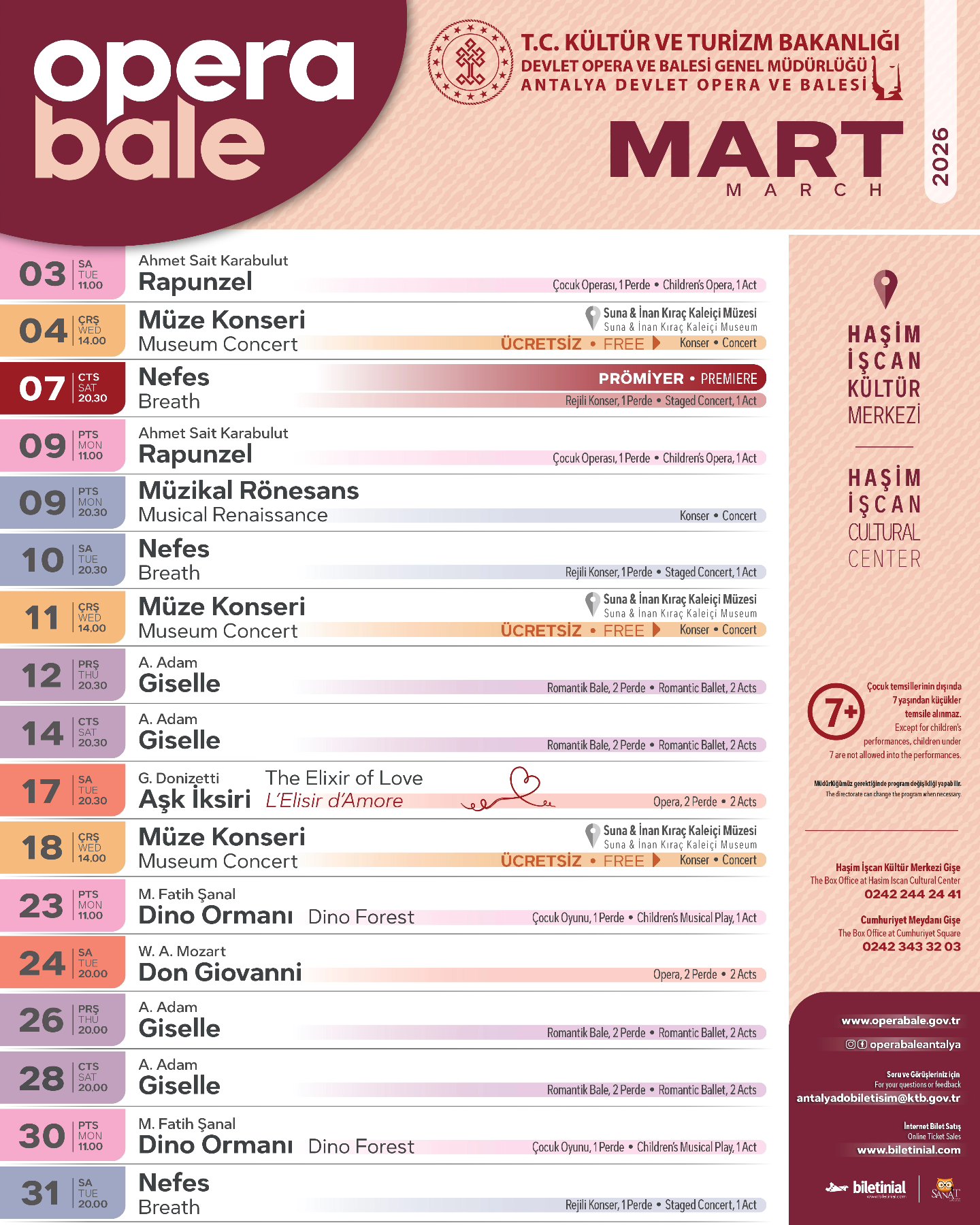 Çocuk temalı iki yapıt var programda, ikisi de AntDOB eski ve mevcut üyesi sanatçılardan. İzmir’e atanan Sait Karabulut’un “Rapunzel” adlı çocuk operası 3 ve 9 Mart’ta saat 11.00’de, Fatih Şanal’ın “Dino Ormanı” adlı çocuk oyunu da 23 ve 30 Mart’ta aynı saatte olmak üzere 2’şer kez sahnelenecek. Üç Müze konseri Suna-İnan Kıraç Kaleiçi Müzesi’nde ve gündüz saat 14.00’te yapılıyor. A. Adam’ın “Giselle” balesi ay içinde; 12-14-26-28 Mart olmak üzere 4 kez tekrarlanacak. 17 Mart’ta “Aşk İksiri”, 24 Mart’ta Don Giovanni operaları var.