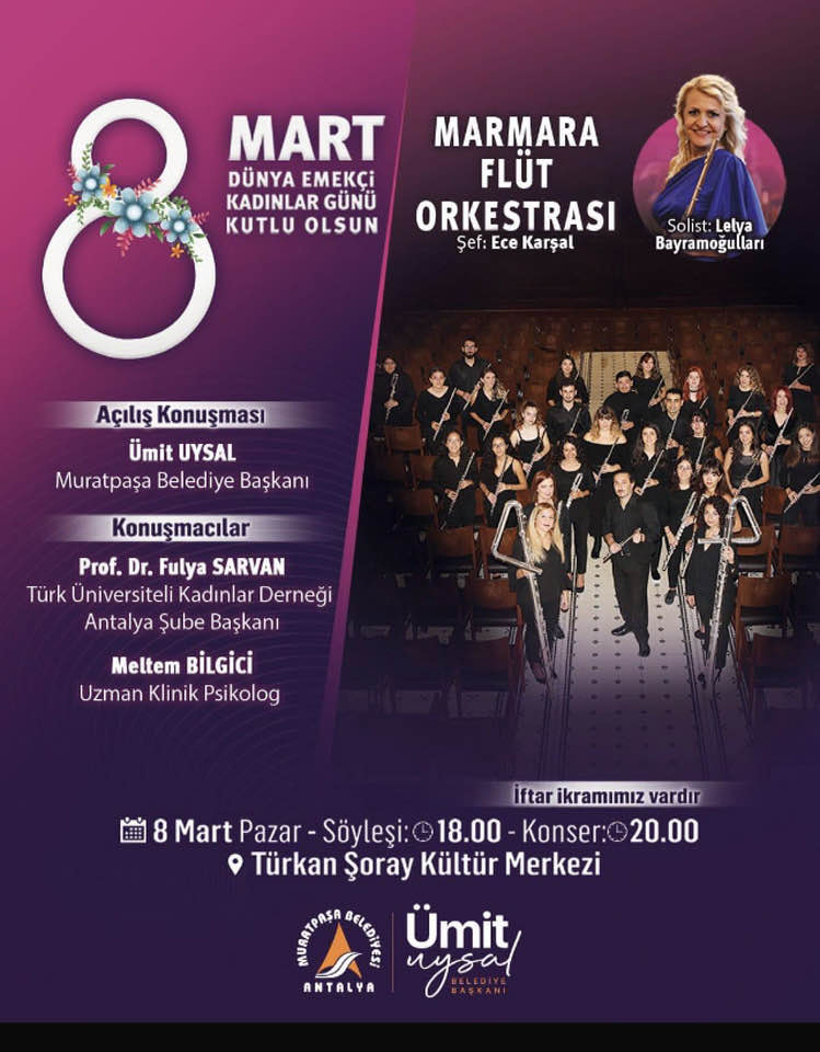 8 Mart Pazar akşamı Marmara Flüt Orkestrası Türkan Şoray Kültür Merkezi’ne konuk oluyor. Şef Ece Karşal, solist Lelya Bayramoğulları’(flüt)nın konuk olacağı konseri Muratpaşa Belediyesi organize ediyor. Konser öncesi, 8 Mart Dünya Emekçi Kadınlar Günü konulu bir söyleşi ve uygun zaman diliminde “iftar ikramı” yapılacak.11 Mart akşamı, Re22 Kültür Sanat piyanist Dengin Ceyhan’ı ağırlayacak. Serinin en özel konseri dersem diğerlerine haksızlık etmiş olur muyum, bilmiyorum. "Piyanonun Kadınları" projesi, klasik müzik dünyasında genellikle erkek bestecilerin gölgesinde kalmış, hakkı teslim edilmemiş veya unutulmaya yüz tutmuş kadın bestecilerin eserlerini gün ışığına çıkaran çok kıymetli bir "vefa ve farkındalık" çalışması. Ceyhan, bu projeyle müziğin sadece notalardan ibaret olmadığını, aynı zamanda bir toplumsal hafıza ve hak arayışı aracı olduğunu kanıtlıyor.