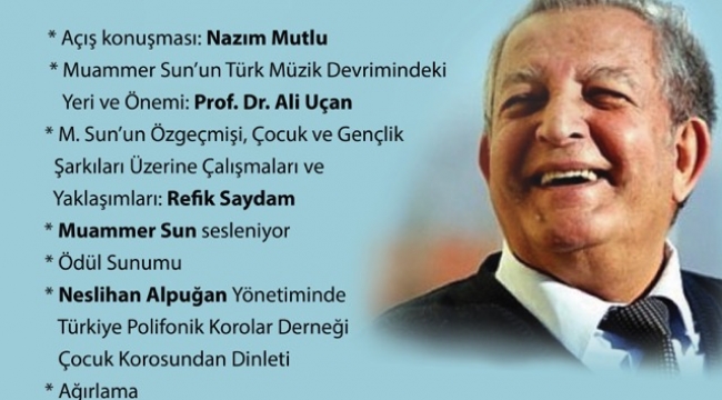 Törende Prof. Sun’un yaşamı ve çalışmalarıyla ilişkin Prof. Dr. Ali Uçan, Prof. Dr. Ertuğrul Bayraktarkatal, Refik Saydam’ın konuşmalarıyla Prof. Sun’un katılımcılara seslenişinden sonra Polifonik Korolar Derneği Çocuk Korosu, Neslihan Alpuğan yönetiminde Sun’un çocuk şarkılarından oluşan bir dinleti sunacak.