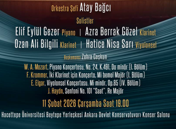Ankara Devlet Konservatuvarı lise ve lisans bölümü öğrencilerinden oluşan Hacettepe Gençlik Senfoni Orkestrası 11 Şubat 2026 Çarşamba akşamı saat 19.00’da zengin programlı bir konserle dinleyici karşısına çıkıyor. Orkestrayı CSO Korno Grubu üyesi, Almanya’da öğrenimi sırasında şef yardıcılıkları yapmış Atay Bağcı yönetecek.Girişi serbest olan konserin programı şöyle: