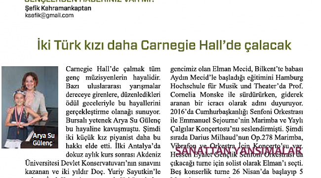 New York'taki Carnegie Hall'de çalmak tüm genç müzisyenlerin hayalidir. Bazı uluslararası yarışmalar, derece girenlere orada düzenledikleri ödül geceleriyle bu hayallerini gerçekleştirme olanağı sunuyor. Bursalı yetenek Arya Su Gülenç bu hayaline kavuştu: