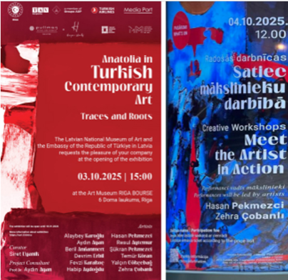 Küratörlüğünü Siret Uyanık’ın, Proje Danışmanlığını Prof. Dr. Aydın Ayan’ın yaptığı Alaybey Karaoğlu, Aydın Ayan, Beril Anılanmert, Devrim Erbil, Fevzi Karakoç, Habip Aydoğdu, Hasan Pekmezci, Resul Aytemur, Şükran Pekmezci, Temür Köran, Yalçın Gökçebağ ve Zehra Çobanlı’dan oluşan, ressam ve seramikçi grubun yer aldığı “İzler ve Kökler: Çağdaş Türk Sanatında Anadolu” Sergisi Türkiye Cumhuriyeti Riga Büyükelçiliği’nce ve Müze Müdürlüğünce gerçekleştirilen, büyük ilgi gören bir törenle 3 Ekim 2025 günü Riga’nın en prestijli sanat mekânlarından tarihi Riga Bourse Müzesi’nde açıldı.
