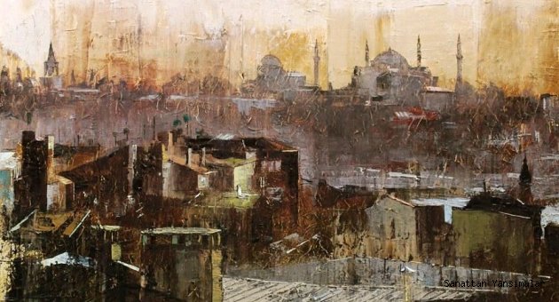 Kadir Ablak kent görünümünün analizini tuvale aktarıyor...
