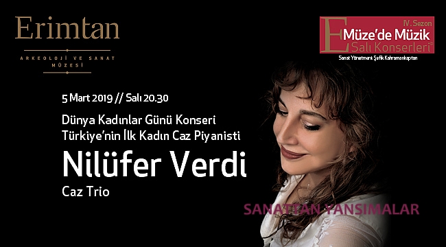 Türkiye'nin ilk kadın caz piyanisti Nilüfer Verdi, trio olarak 5 Mart 2019 Salı akşamı, “Dünya Emekçi Kadınlar Günü” özel konserinde Erimtan Müzesi'nde sahneye çıkıyor. Caz triosunu kontrabasçı Apostolos Sideris ve davulcu Burak Durman'la oluşturan Nilüfer Verdi, caz piyano eğitimini ünlü Berklee Koleji'nde almış, 3 özel albüm yayımlamış deneyimli bir sanatçı. Amerika, Avrupa ve Türkiye'de önemli caz kulüplerinde çalan sanatçı, İstanbul , Boğaziçi , Akbank, Eskişehir, Ankara , Denizli Lykidia, Alanya, Bilsak, Parliament, Yapı Kredi, Houston, ,CAN-AM, Port Huron Caz Festivallerine katıldı. Amerika, Kanada ve Çin Halk Cumhuriyeti'nde çeşitli festivallerde de çaldı. Kendi kompozisyonlarından oluşan iki CD'si “Mana” ve “İzhar” ile Türkiye coğrafyasına ait türkūlerden oluşan ūçūncū CD'si “Knidos”taki tūm aranjmanları kendisi yapan Verdi, yenialbüm çalışmalarını da sürdürüyor.