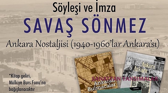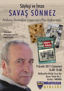 Ankara konusunda çalışmalarıyla tanınan yazar Savaş Sönmez, 9 Aralık 2017 Cumartesi günü saat 16.00-18.00 arasında Mülkiyeliler Birliği Teras Katı'nda "1940 Sonları - 1960 Başları Ankarası" konulu bir söyleşide okurlarıyla ve Ankara meraklılarıyla buluşacak.