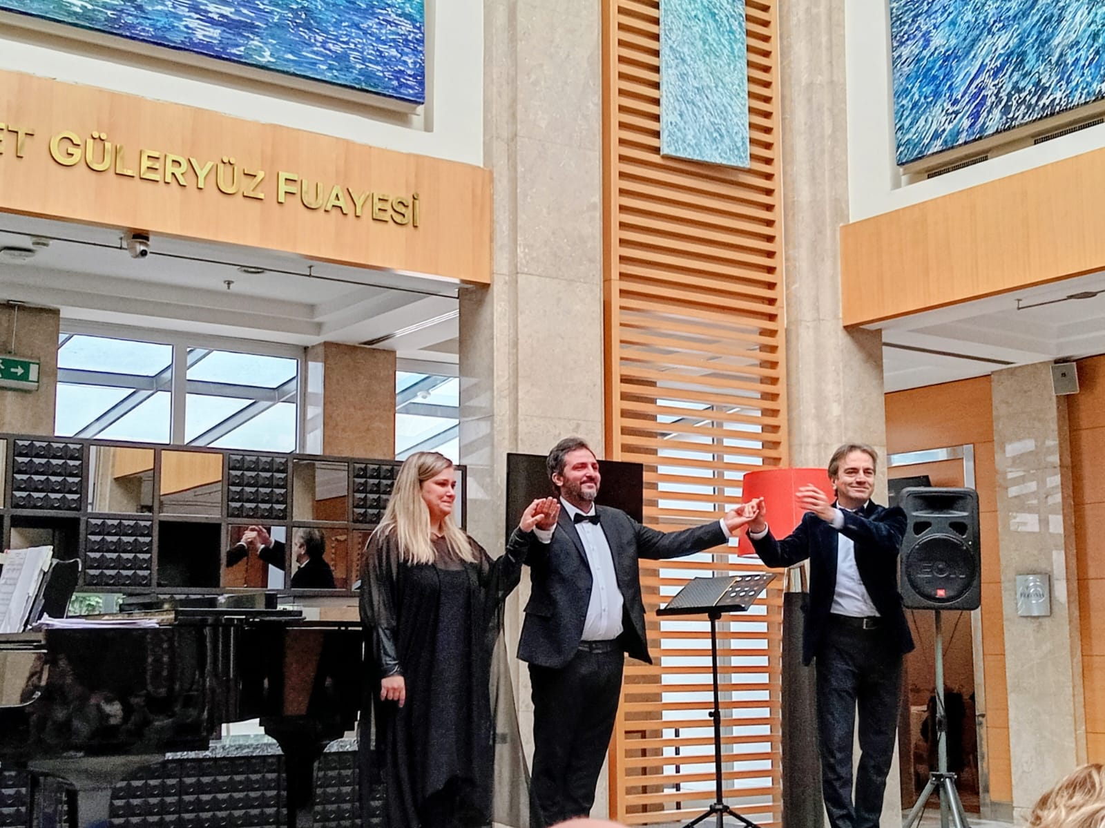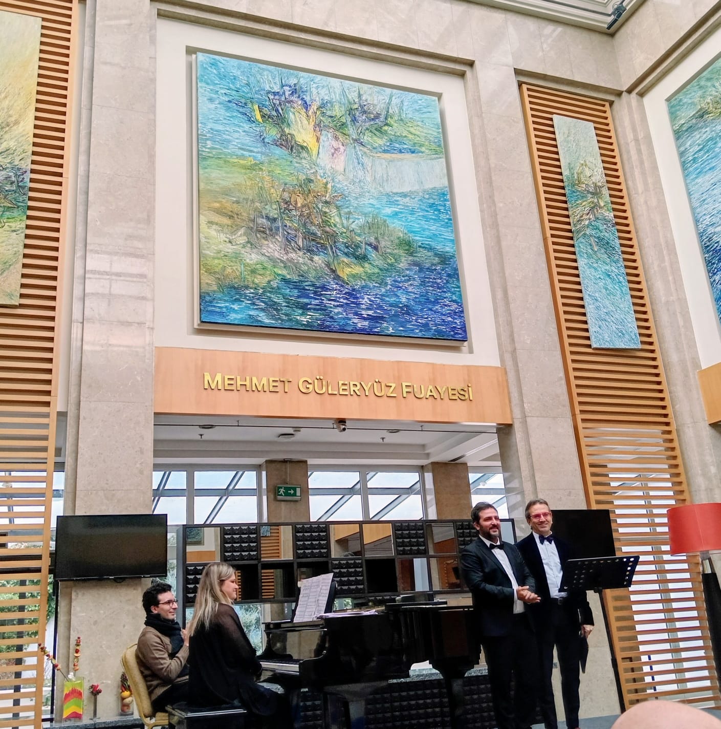 Ressam Mehmet Güleryüz’ün adının verildiği Salon (ya da mekândaki adıyla Fuaye) ressamın dev tablolarıyla çevrili, çok yüksek tavanlı, camın çokça kullanıldığı, geniş bir mekân. Lâkin kanımızca ses güzel yansıdı, güzel tınladı. Elif Akar Kosman’ın zarif eşliğinde, tatlı koyu, basa yaklaşan bariton sesiyle Umut Kosman; giderek daha açılan, aydınlık bariton sesiyle Serhan Bali yapıtları çok güzel seslendirdiler, keyif dolu bir Pazar sabahı oldu.