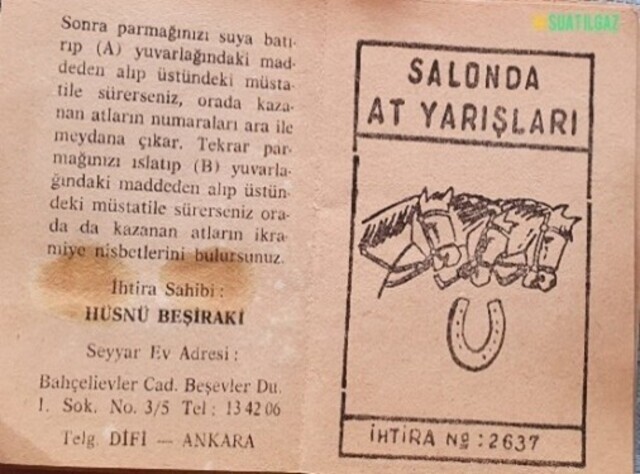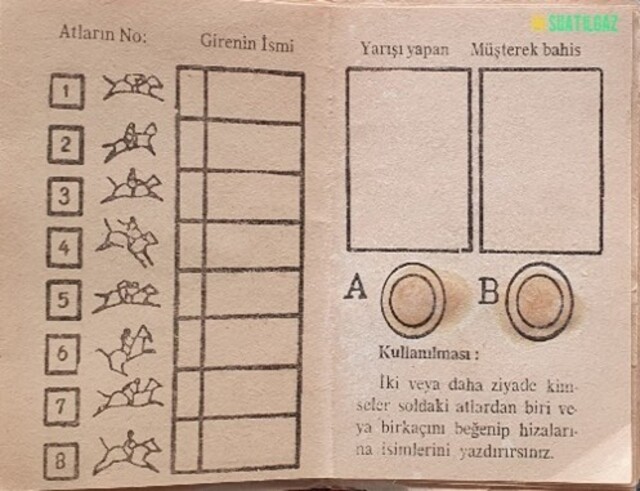 Bu özel at yarışı kâğıtlarının iç kısmının sol yarısında, tahminlerin yazılacağı boşluklar; sağ yarısında ise sonuçların belireceği iki boş dikdörtgen vardı. Bu dikdörtgenlerin altında ise, A ve B harfleriyle belirlenmiş dairelerin içinde özel bir toz bulunurdu. Kâğıdın sol yarısına tahminler yazıldıktan sonra, oyunculardan biri parmağını ıslatarak, önce A’daki tozdan alır ve hemen üzerindeki boşluğa sürer; burada, kazanan atların numaraları belirirdi. Ardından parmağını tekrar ıslatıp, bu sefer de B dairesindeki tozdan alır, onu da hemen üstündeki diğer dikdörtgeninin içine sürerdi. Söz konusu boşlukta da, kazanan atların ikramiye oranları görünürdü. Hayli heyecanlı ve eğlenceli bir oyundu. Bu özel at yarışı kâğıtlarını günümüzde bulmak mümkün değil; ayrıca çoğu kimse bu oyunu bilmiyor bile.