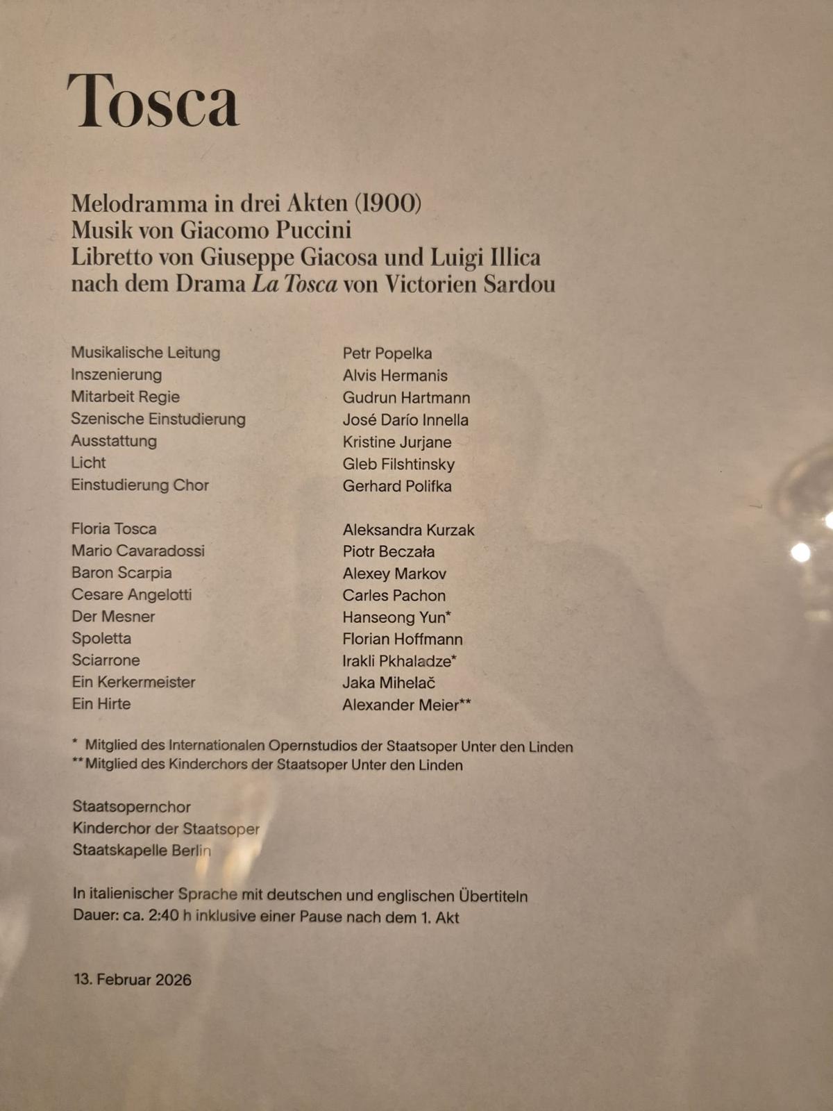 Eser, Victorien Sardou’nun oyunundan Giuseppe Giacosa ve Luigi Illica tarafından operaya uyarlanan üç perdelik bir melodram. Berlin’deki yorumda müzikal yönetim Petr Popelka’ya, reji Alvis Hermanis’e aitti. Sahne ve kostümler Kristīne Jurjāne, ışık tasarımı Gleb Filshtinsky, koro hazırlığı ise Gerhard Polifka imzası taşıdı. Orkestra çukurunda her zamanki yüksek standardıyla Staatskapelle Berlin yer aldı.
