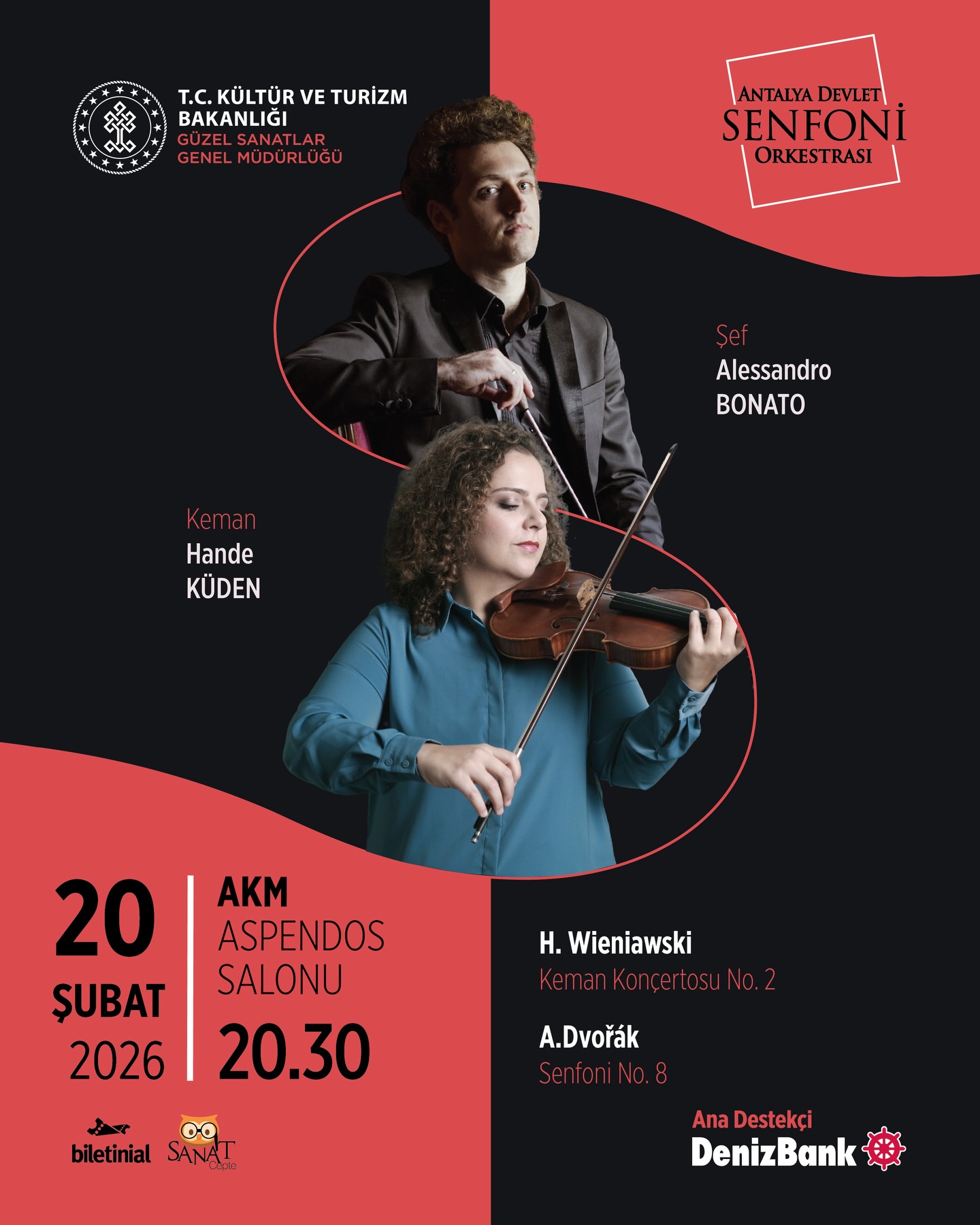 Antalya Devlet Senfoni Orkestrası gelecek konserinde uluslararası başarılara imza atmış bir kemancımız, Hande Küden’i konuk ediyor. Bu konseri şef Alessandro Bonato yönetecek ve H. Wieniawski’nin “Keman Konçertosu No. 2” ile A.Dvorak “Senfoni No.8” seslendirilecek.