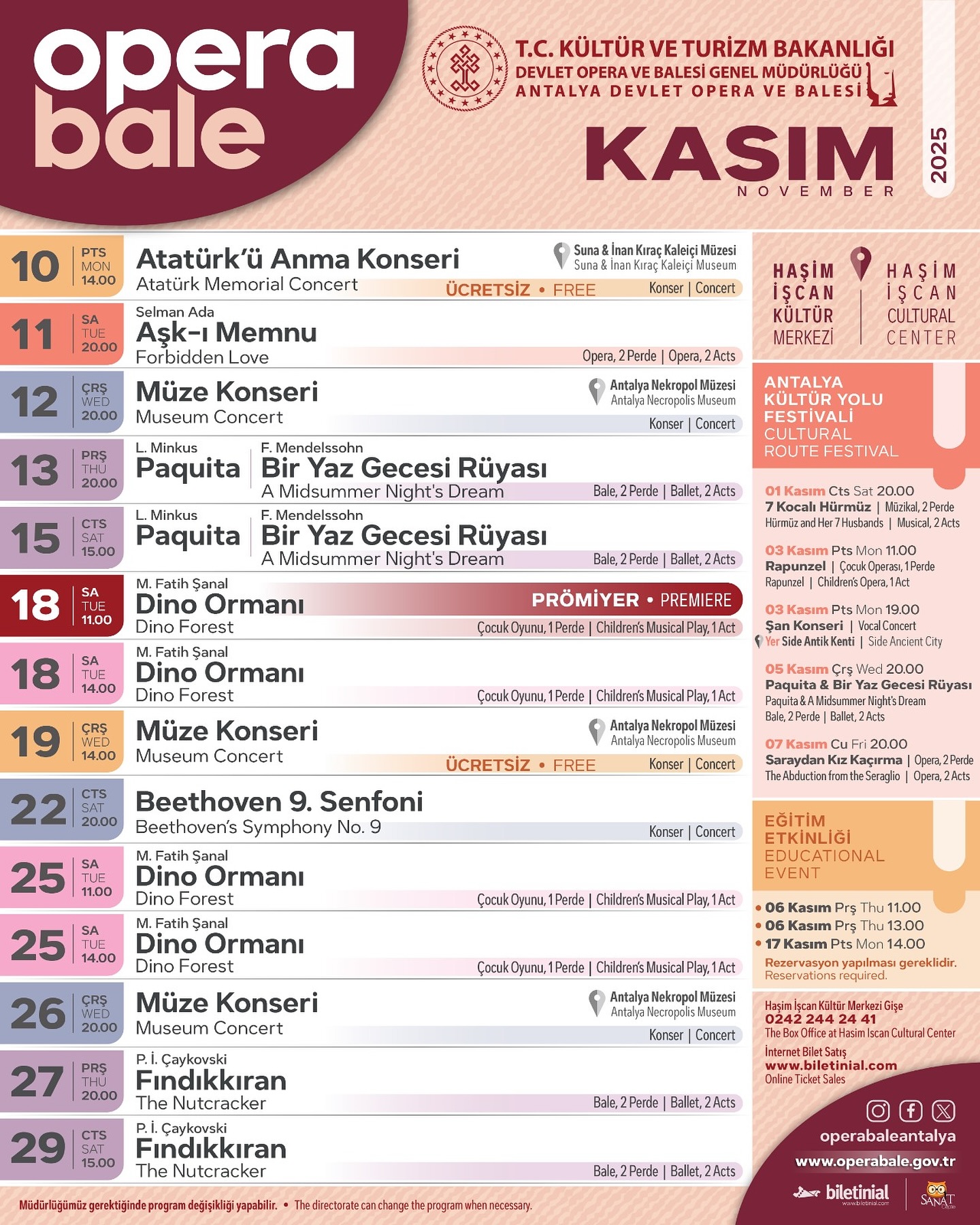 Antalya Devlet Opera ve Balesi, Kasım 2025 programını duyurdu. Bu ayın etkinlikleri iki devreli planmış; Birincisi, Kültür Yolu Festivali kapsamında olanlar; 1 Kasım 7 Kocalı Hürmüz müzikali, 3 Kasım’da Rapunzel adlı çocuk oyunu ve Side Antik Kenti’nde Şan Konseri, 5 Kasım’da Paquita ve Bir Yaz Gecesi Rüyası(bale) ve 7 Kasım için Saraydan Kız Kaçırma Operası öngörülmüş.
