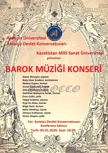 Akdeniz Üniversitesi Antalya Devlet Konservatuvarı’nda "Kazakistan Milli Sanat Üniversitesi Geleneksel" temalı bir Barok Müzik Konseri düzenlenmişti, bu konseri de izledim. Türkiye, Azerbaycan, Kazakistan ve Kırgızistan'dan büyük çoğunluğu akademisyenlerden oluşan sanatçılarının katıldığı konsere, ne hikmetse Kazakistanlı diplomatlar pek ilgi göstermedi. Başka etkinliklerde konsolos düzeyinde temsil ediliyordu Kazakistan.