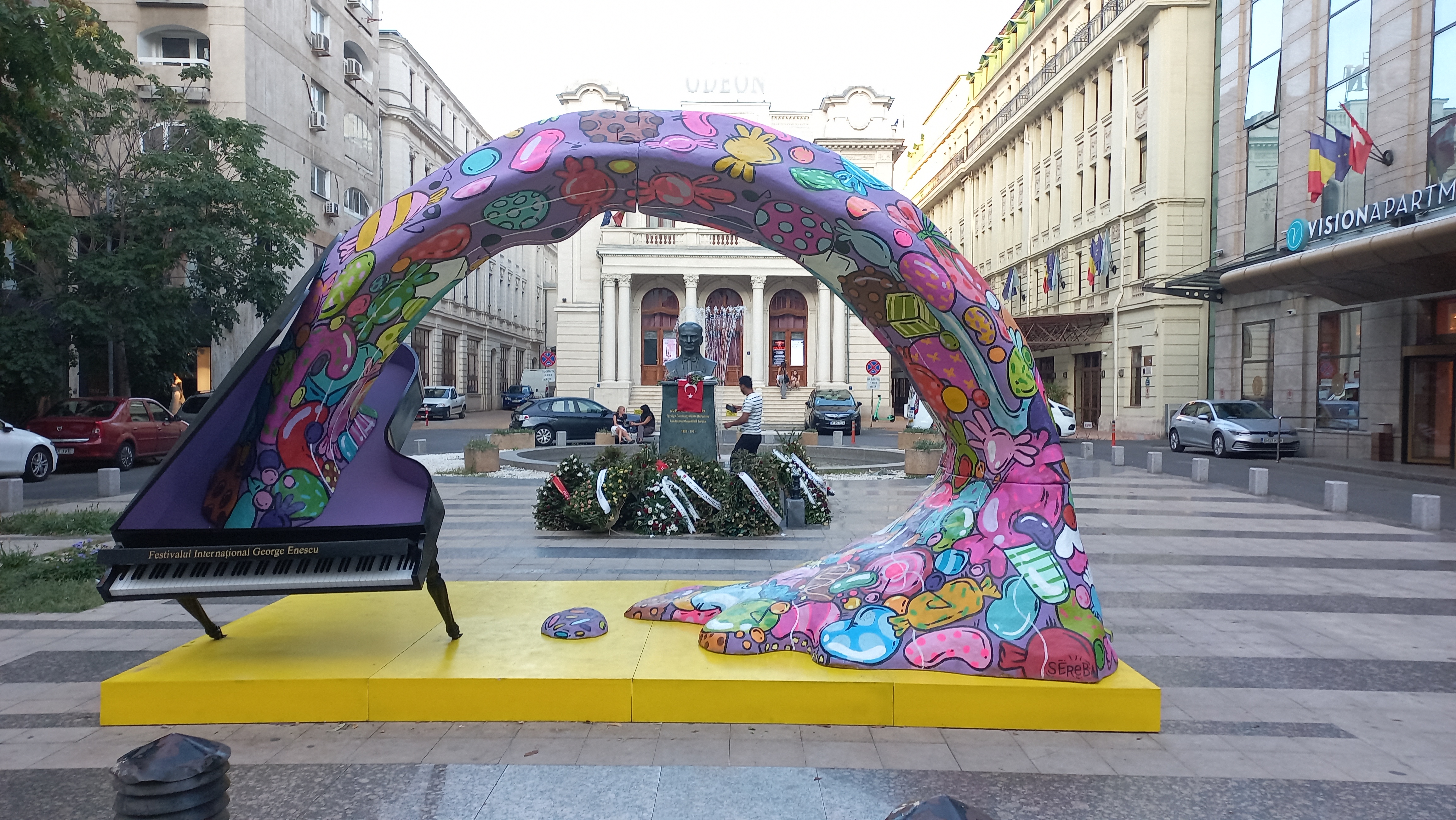 Kaidesinde ‘Yurtta Barış, Dünyada Barış’ yazılı bu anıtı hemen, ilk gittiğimiz 30 Ağustos gecesi ziyaret ettik. Kaldığımız süre boyunca her gün yolumuzu oradan geçirdik. Ön tarafa geçici konulan George Enescu Festivali tanıtımı ve arkada tiyatro binası manzarası ile anıt içimizi ferahlattı.