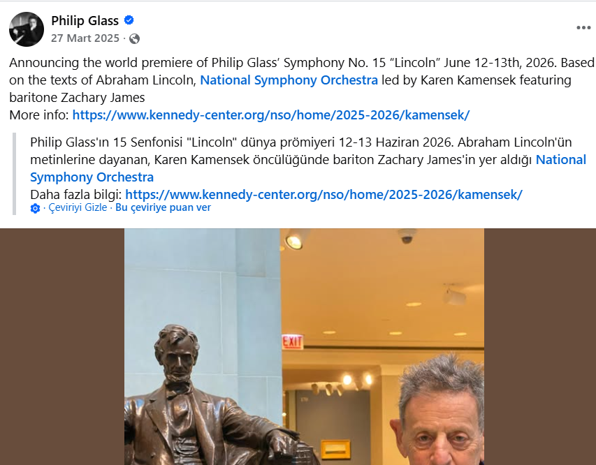 Dün, yani, 27 Ocak 2026 tarihinde Glass bir duyuru daha yayınladı. ’15. Senfoni Abraham Lincoln’un hayatını anlatıyor. Kennedy Merkezi yönetiminin bugün savunduğu değerler senfoni ile tamamen zıt. O nedenle senfonimin dünya prömiyerini bu liderlik altındaki Kennedy Merkezi’nden çekmeye karar verdim’.