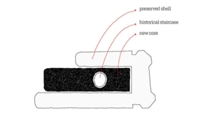 Binanın tesisatını da içeren bu bölüm zemine sabitleniyor. Ayrıca bu bölümdeki yüksek ve geniş galeriler, çağdaş heykellerle yerleştirmelerin sergilenmesine olanak veriyor. Betonarme çekirdekte yer alan asansörlere binerken solda gördüğünüz merdivenlerle asansör boşluğu, girdiğiniz binanın geçmişini gözünüzün önüne getiriyor. Binanın müzeye dönüşüm öyküsü, katlarda asansörlerin yanındaki çizimlerde görülebildiği gibi, İş Bankası Kültür Yayınları arasında çıkan Ertuğ Uçar ile Feride Çiçekoğlu’nun yazdığı Bina Bina İçinde kitabında bulunabilir.