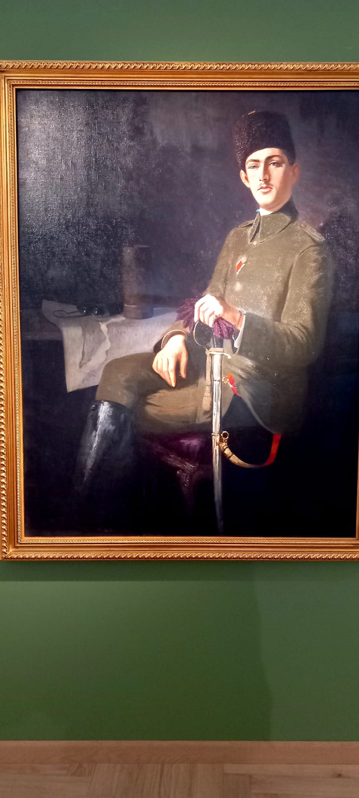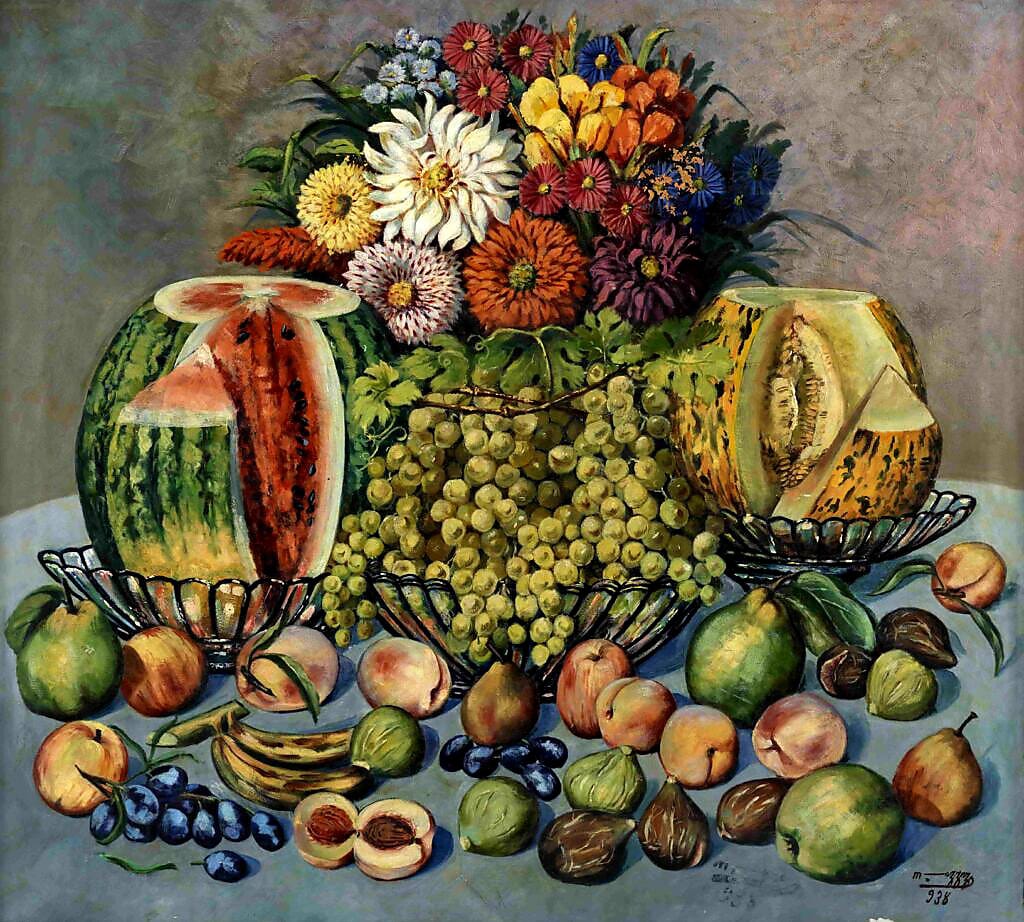 İlk bölümde en dikkatimi çeken bir başka resim ise pek çok izlenimci ölüdoğa tablosu arasında farklı çizgileriyle göze çarpan Meyveli ve Çiçekli Natürmort… Müzeye giriş için bilet yerine verilen rozette de yer alan bu tablo, asker kökenli ressamlardan Mehmet Muazzez’in (1871-1956) imzasını taşıyor. Daha önce aklımda kalan bir resmini anımsayamadığım, Kadıköylü Muazzez olarak da bilinen ressamımız Bahriye’nin mızıka takımındayken Sanayi-i Nefise Mektebi’ne devam etmiş, bitirince Bahriye’den ayrılmış; bir süre bu okulda ders vermiş, 1930’larda okulun müdürlüğünü de yapmış. Çok yönlü bir sanatçıymış: Ortaoyunlarında oynamış, kendi çizdiği Karagöz Hacivat tipleriyle Karagöz oynatmış.