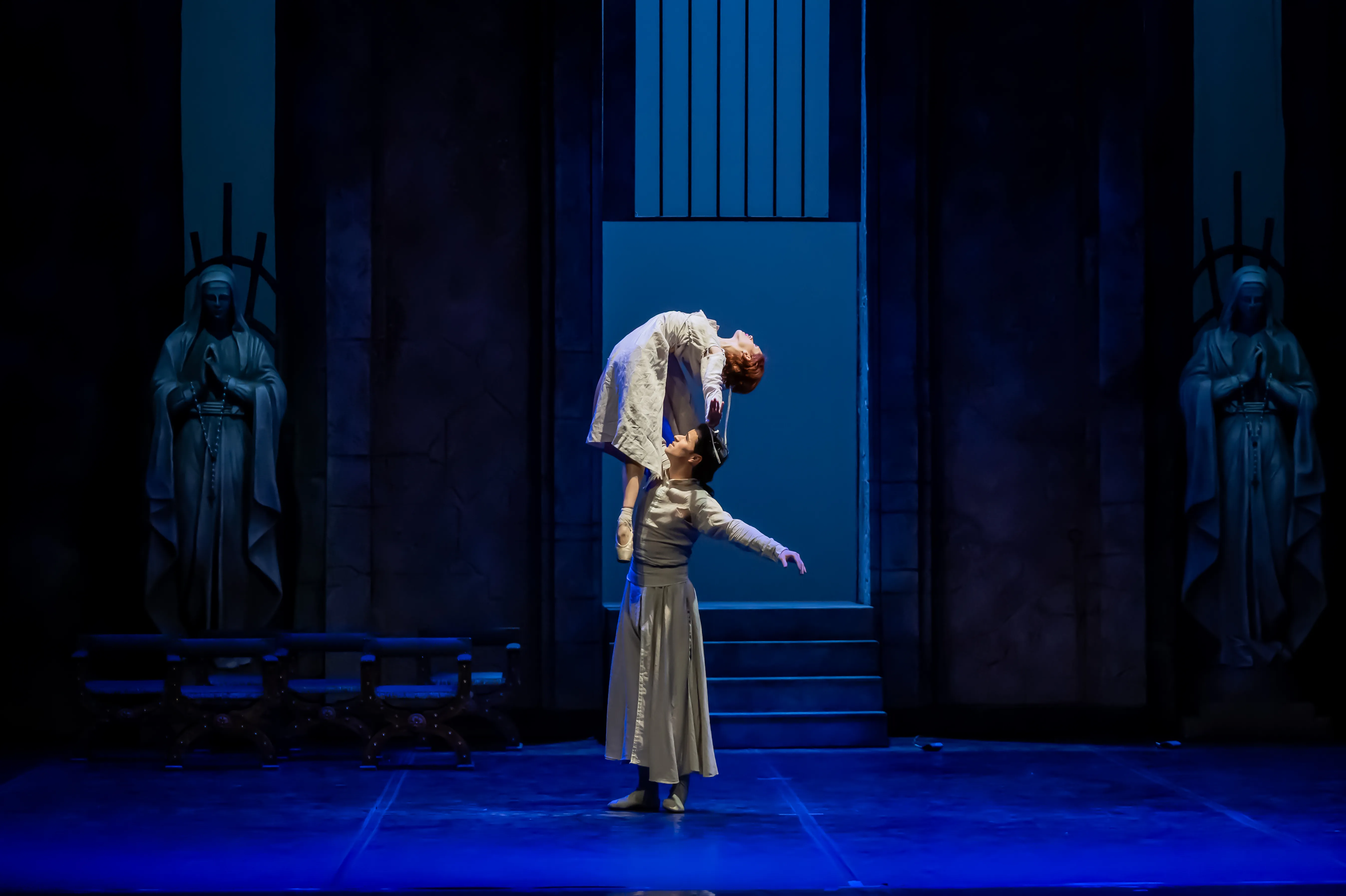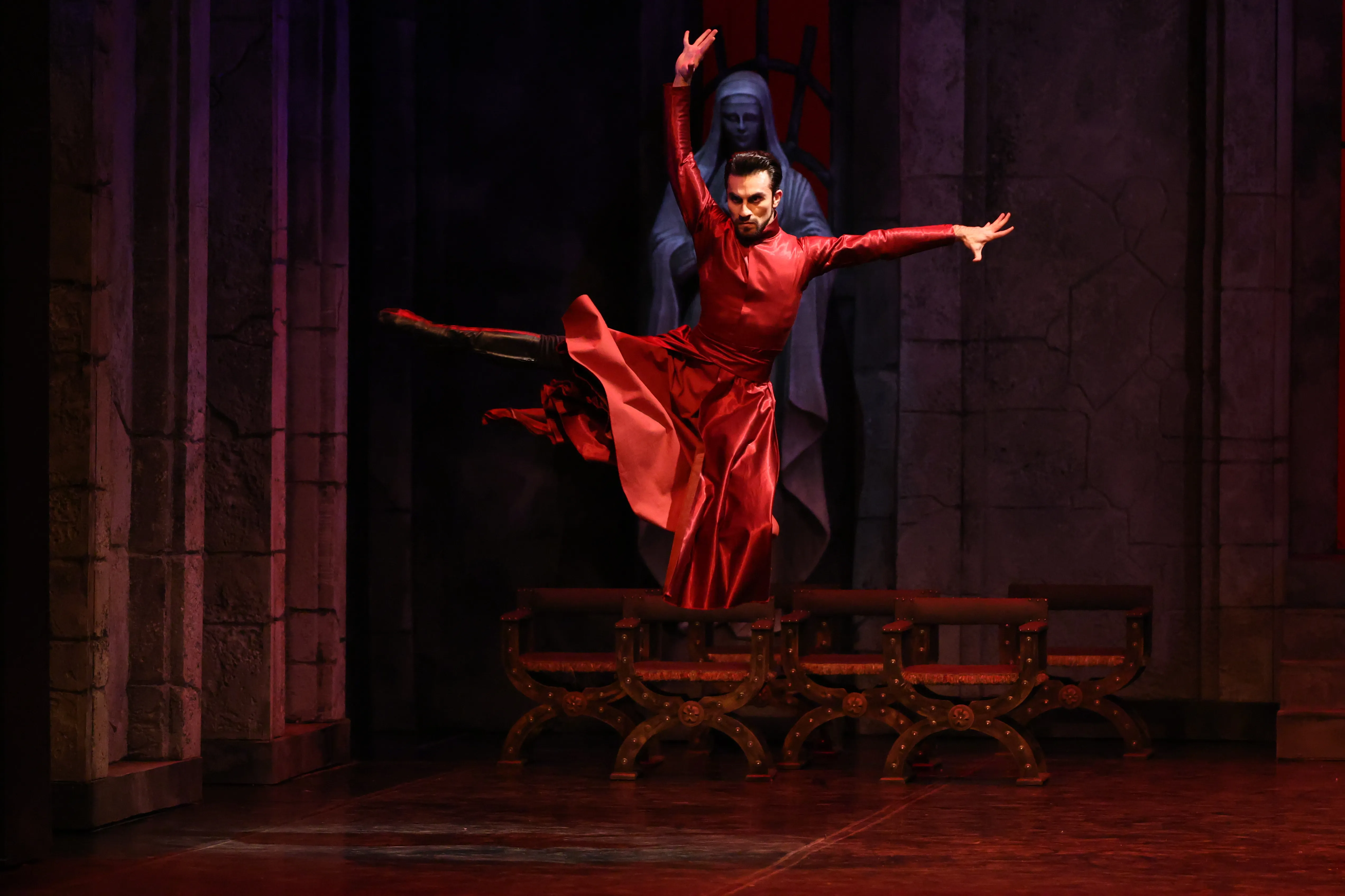 Jeanne büyük bir azimle önüne çıkan engelleri de aşacak. Jeanne’ın karşısındaki en büyük engel ondan nefret eden kırmızılar içinde Rahip (Umutcan Arzuman). Bir bakıma Beyazlı Melek’in kaşısında Kırmızılı Şeytan. Belki de bu karakter Burgonya Dükü’nü hatırlatıyor. Tarihte, Jeanne d’Arc’ın yaşadığı dönemde İngilizler tarfaından işgal edilmiş olan Fransa’nın çeşitli bölgelerinde Burgonyalılar İngilizlerle birleştikleri için Jeanne’I yakalayıp İngilizlere teslim ederler. 1429 tarihinde Jeanne’ın sayesinde Kral olan VII. Charles da artık Kral olduğu için Burgonyalıları tutar ve Jeanne’a ihanet eder. Engizisyon Mahkemesi’nde yargılanan Jeanne suçlu bulunup yakılır. Baledeki Rahip de eserin başından beri Jeanne’den nefret eder ve Kral’ı uyarmak ister.