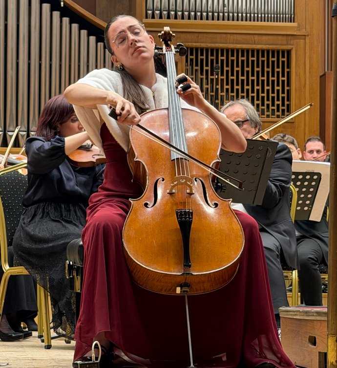 Re Majör Viyolonsel Konçertosu’da Güneş, olgunluk dönemine ait dramatik dokuyu dikkatle işledi. Ezbere çaldığı konçertonun özellikle Adagio kısmında zamanın askıya alındığı o iç monolog hissi, salonu derinden etkiledi. Rondo’nun dönüşlerinde artan enerji, formun devingen zekâsını berrak bir bilinçle ortaya koydu.