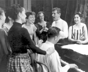 Leonard Bernstein 1957’de Batı Yakası Hikâyesi’nin provasında. Bestecinin solunda prömiyerde Maria’yı oynayan Carol Lawrence, piyanoda söz yazarı Stephen Sondheim (Foto: Leonard Bernstein Collection, Music Division, Library of Congress).
