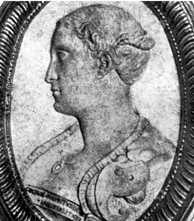 Francesca Caccini’yi gösteren bir madalyon. Sol alttaki ibare “Cechine Pulchritudinis Immortalituti” (Ebedi mükemmelliğin Cechine’si).