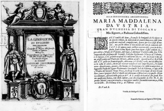 Francesca Caccini'nin “La liberazione di Ruggiero dall’isola d’Alcina” operasının partisyonunun kapağı ve ithaf sayfası. Kapakta verilen bilgiye göre eser, müziği Francesca Caccini ne Signorini Malaspina tarafından Ekselânsları Polonya ve İsveç Prensi Ladislao Sigismondo’ya ithafen bestelenmiș, Majesteleri Avusturya Büyük Düșesi ve Toskana Büyük Düșesi’nin Poggio imparatorluk köșkünde sergilenen La Liberazione di Ruggiero dall’Isola d’Alcina bașlıklı bale. İthaf sayfasında da “Serenissima Arciduchessa Maria Maddalena d'Austria, Gran Duchessa di Toscana” ibaresinin ardından verilen yer ve tarih Floransa, 4 Şubat 1625. İmza olarak “Francesca Caccini ne Signorini Malaspina” var; Francesca’nın ilk eşi Giovanni Battista soyadı olarak Signorini veya Signorini-Malaspina kullanıyordu (Bibliothèque nationale de France).