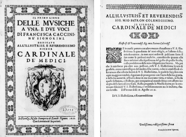 Francesca Caccini'nin “Il Primo libro delle musiche” adlı, İtalyanca ve Latince olmak üzere tek ve iki ses için 36 adet kutsal ve seküler şarkı ve çeşitli stillerde madrigallerden oluşan bir beste koleksiyonu, 1618'de Kardinal Carlo de Medici’ye ithafen yayınlandı (Bibliothèque nationale de France).