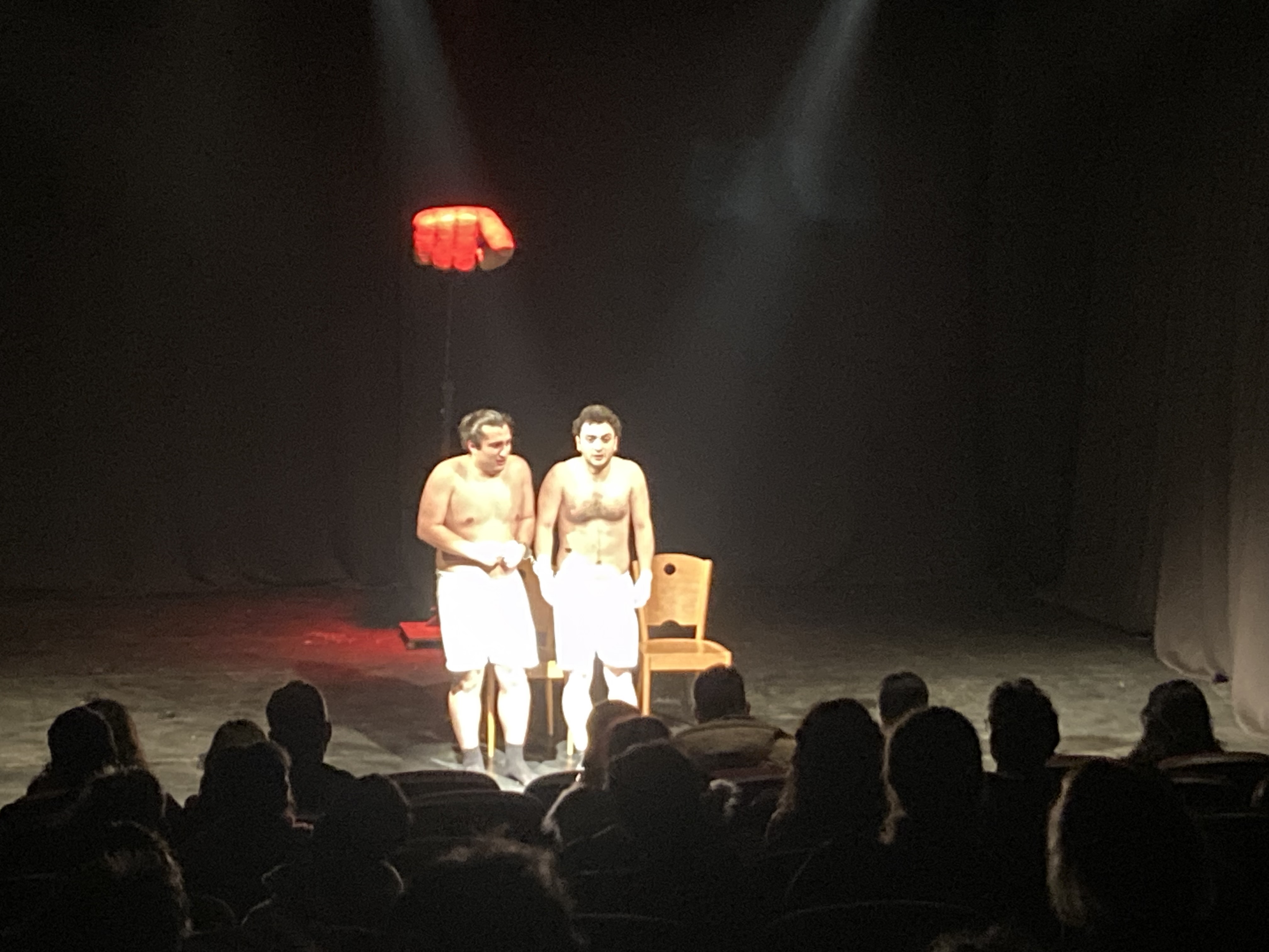 İki oyuncunun rap gibi ritimle müzikal hareket dizgesi bana John Adams bestelerini ve Erdal İnci’nin “Tökezleyenler” adlı video yapıtını çağrıştırdı (https://www.instagram.com/reels/DL61rHHslA1/). Sohbette bu tür soyut sahne performansın söz ve hareket tam senkron olduğundan “fiziksel veya beden ağırlıklı ansambl oyun” olarak tanımlanabileceği üzerinde duruldu.