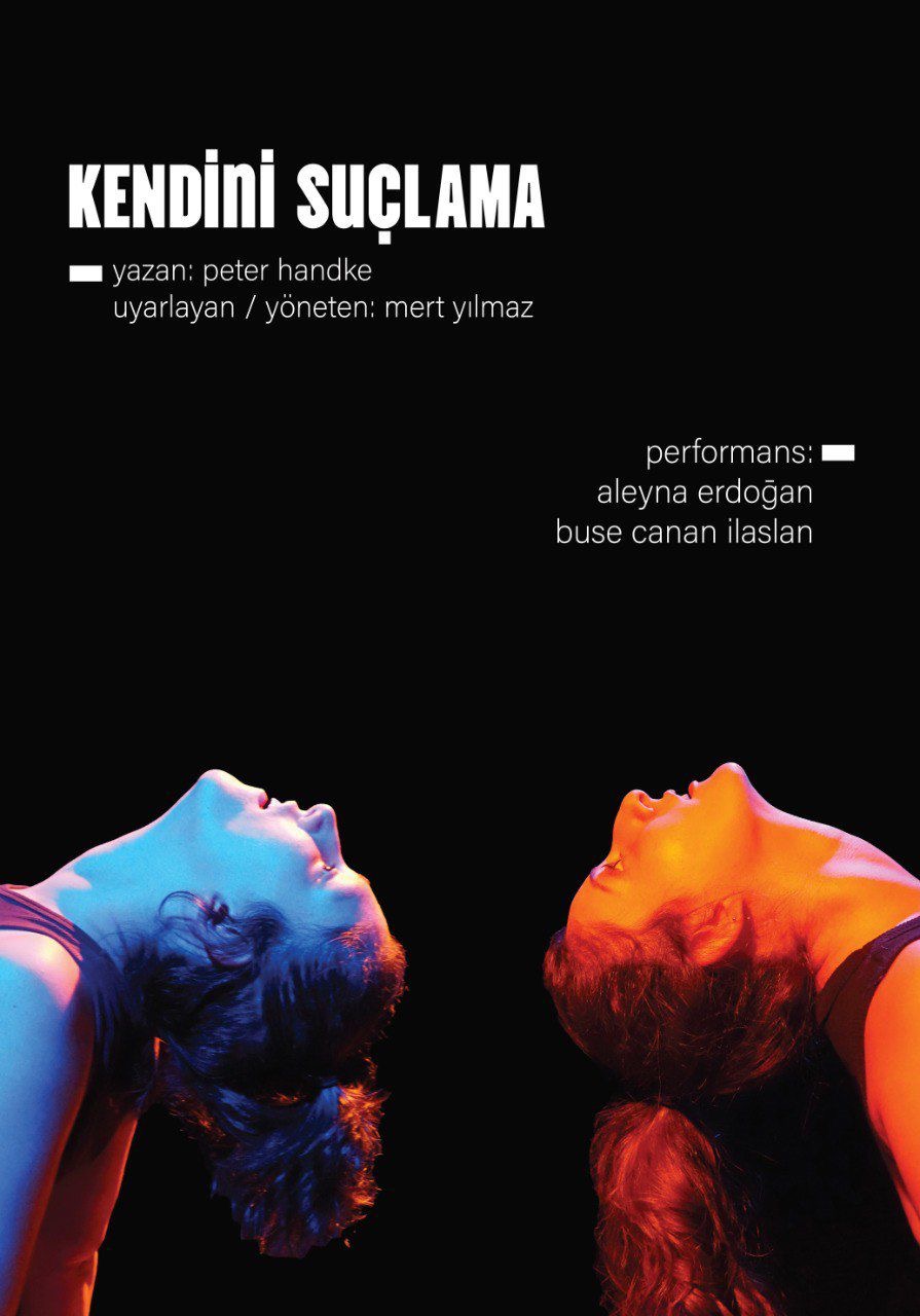 İzlenimlerim ve Temsil Sonrası Sohbet: Her şeyden önce yazar Peter Handke denilince benim için akan sular durur. Çünkü Handke, Wim Wenders’ın Arzunun Kanatları (Der Himmel über Berlin) adlı filminin senaryo yazarlarından biridir ve bu film yaşamımın yönünü değiştirmiştir. Kendini Suçlama’nın metni tekrarlamalar ve zıtlıklar içeren, içten söylenme halini yansıtan basit bir metin gibi durmakla beraber evrensel bir mesaj. Oyun ise düz metnin dansla yürüme şeklinde tiyatrolaştırılmış haliydi. “Dansla yürüme ve söz eşliğinde” anlatım denemesi bir tür “hareketin kendisini de içerik yapma” denemesiydi.