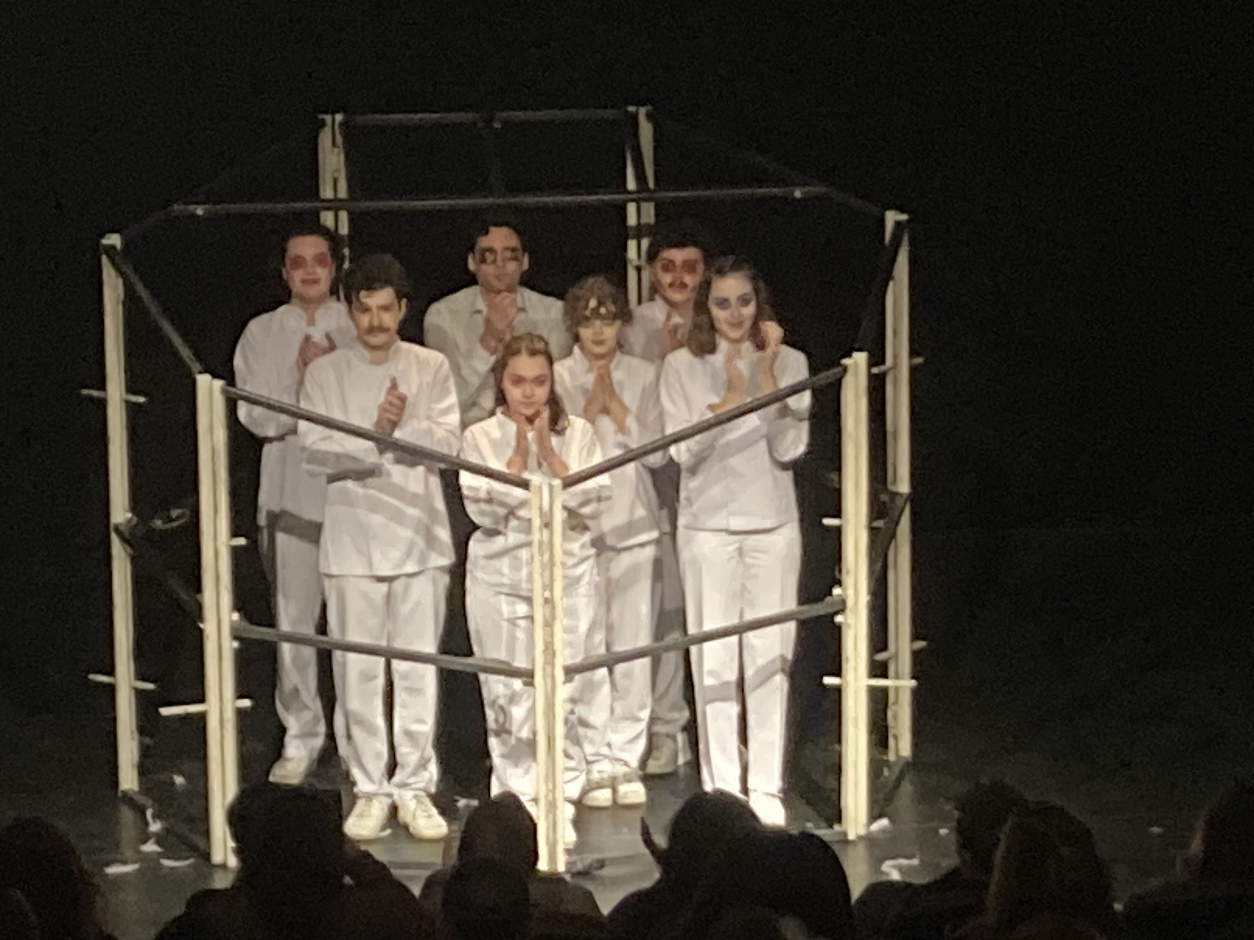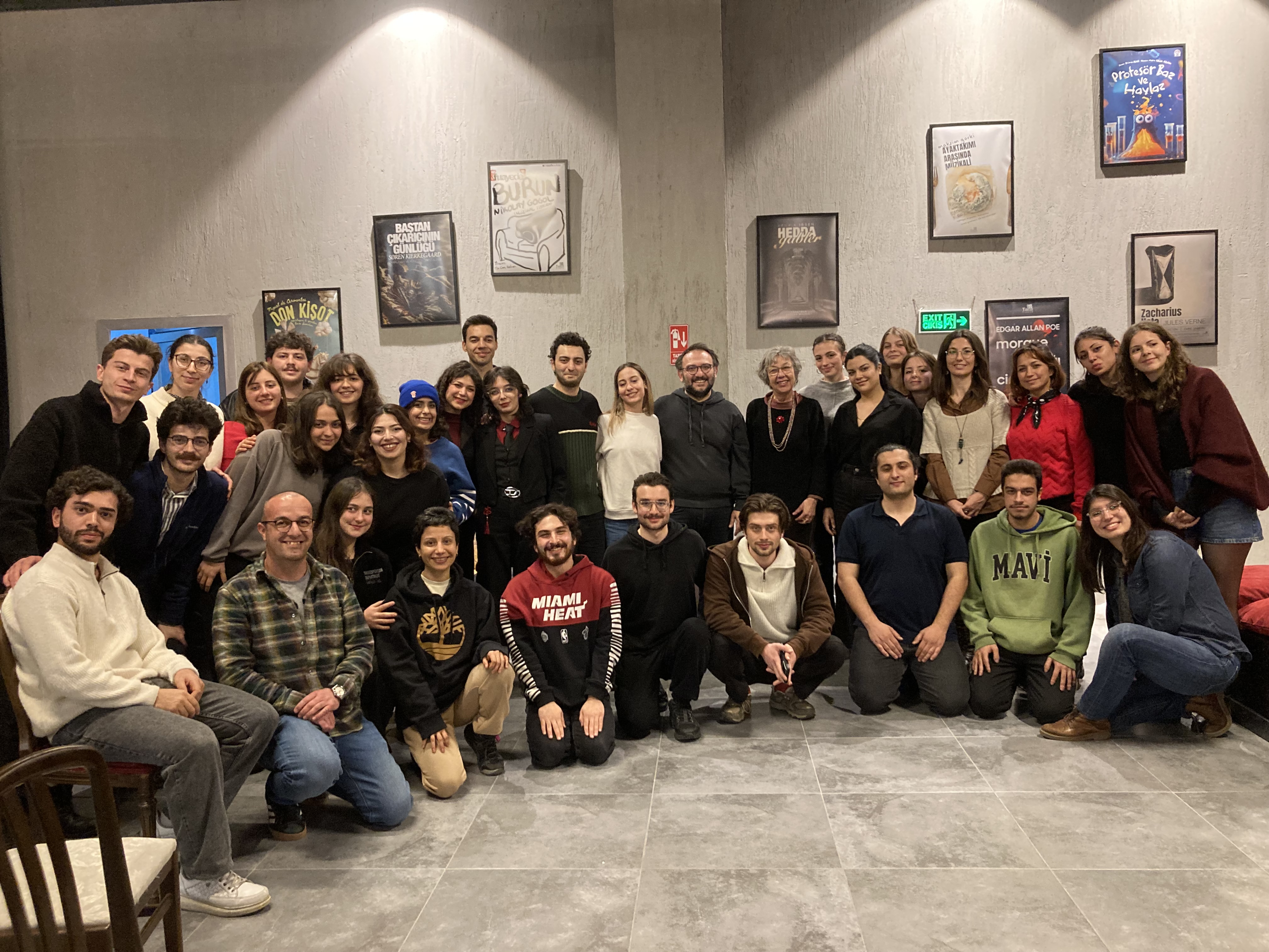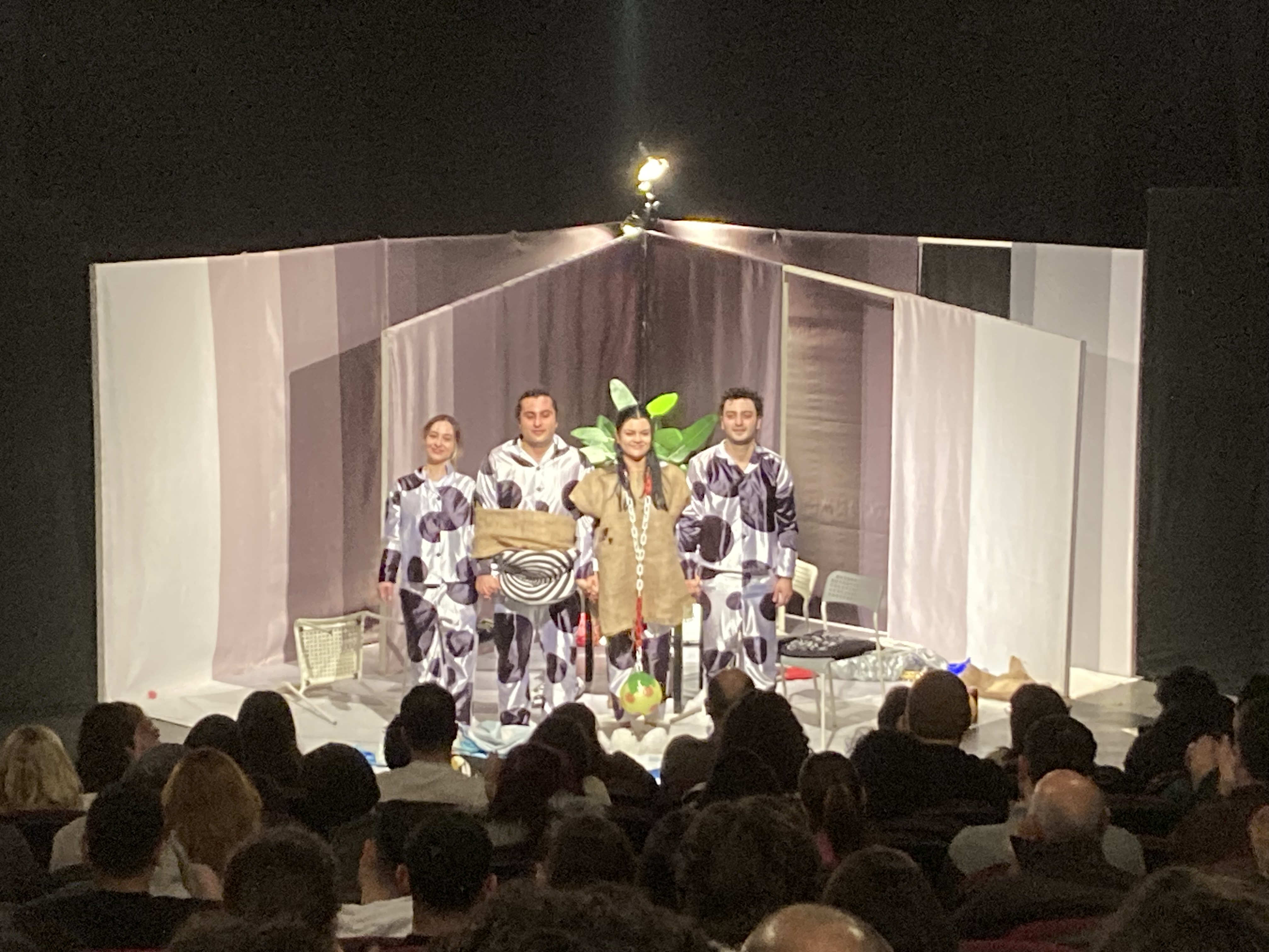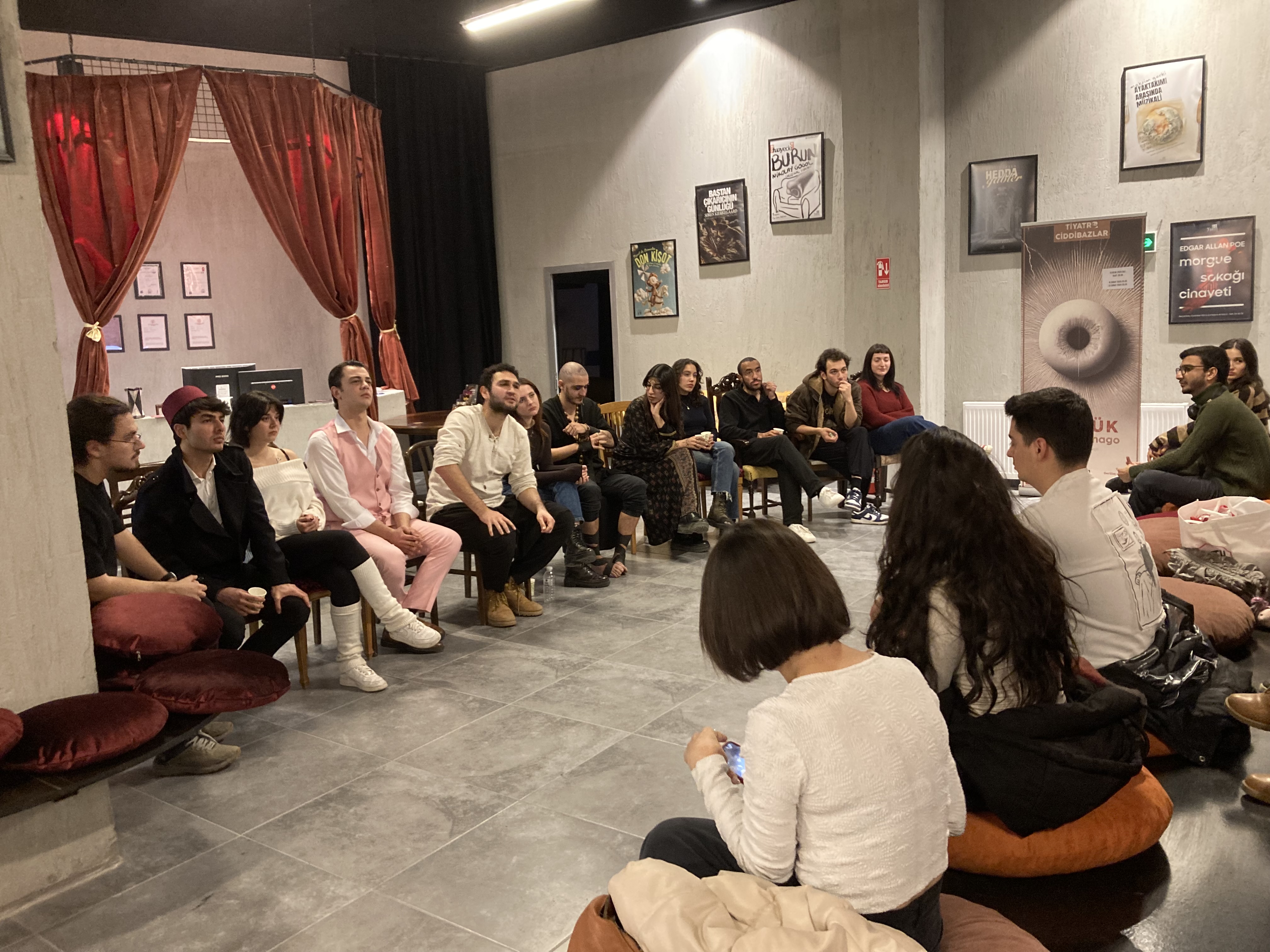 İzlenimlerim ve Temsil Sonrası Sohbet: Sohbetin başında yönetmen Alper, “absürt tiyatro, gerçekçi tiyatrodan daha fazla seyircinin algısını kırabilir mi?”, sorusunu ortaya attı. “Ya oyuncular?”, diye düşünürsek, onlar da metine ve sahnelemeye güvendiğinde sahnede sadece oyunculuk değil aynı zamanda eğlenme deneyimi de yaşamış oluyorlar ki bu Gestalt psikolojisinin temellerinden biri olan seyirciyle etkileşime açık bir ortak deneyim alanı oluşturuyor. Nitekim sadece üçüncü temsil olmasına rağmen oyuncular çok rahat oynadılar. Absürt oyunlarda ritim tutturmak önemli, müzikal bir ritim olmalı; doğaçlama ya da sezgisel değil. Bu ritmin rezonansı seyirciyle sahne arasındaki cam duvarı (dördüncü duvar) kırabildiğinde sanat özne değil yaşam deneyiminin vazgeçilmez unsuru haline geliyor.