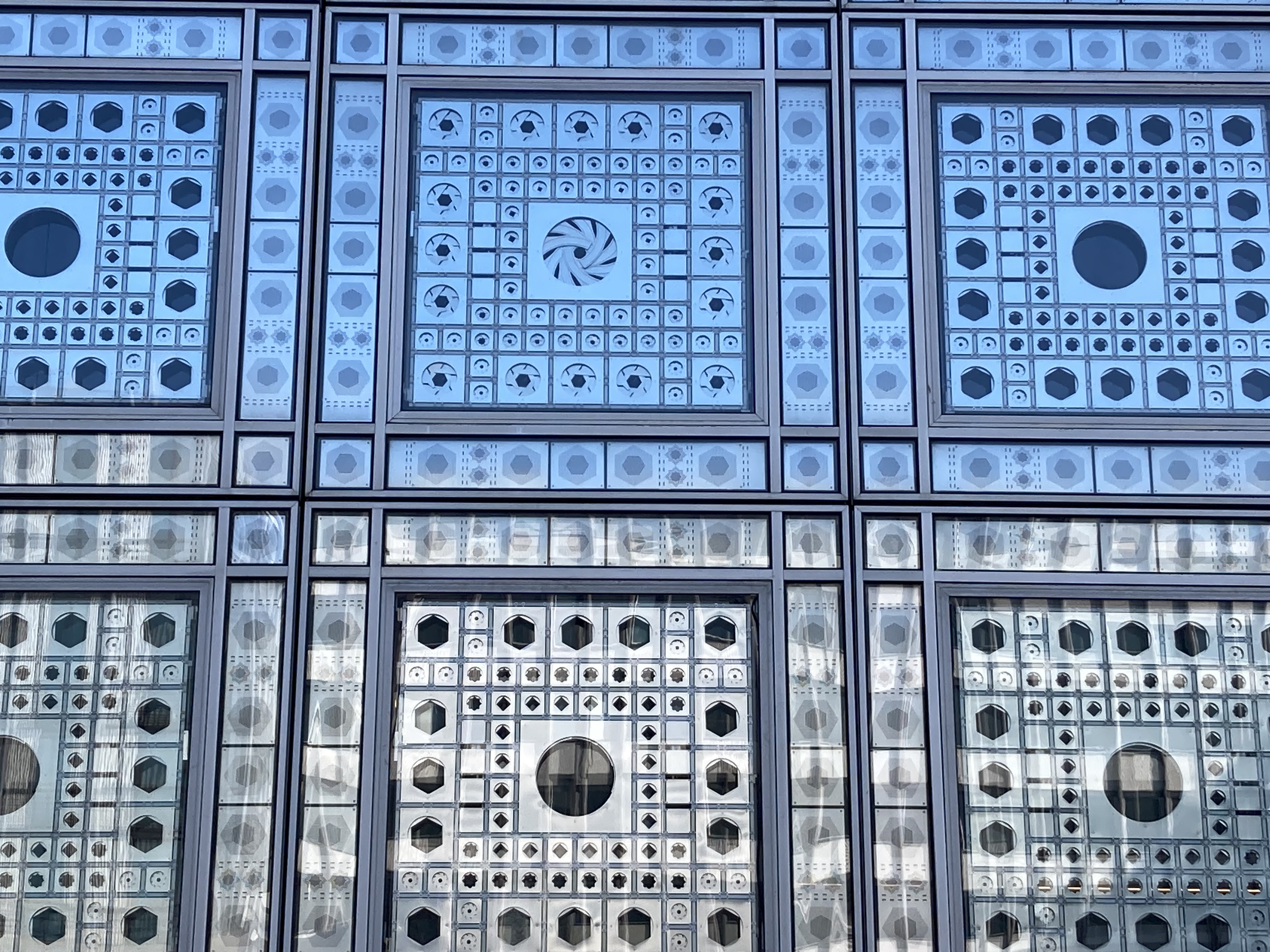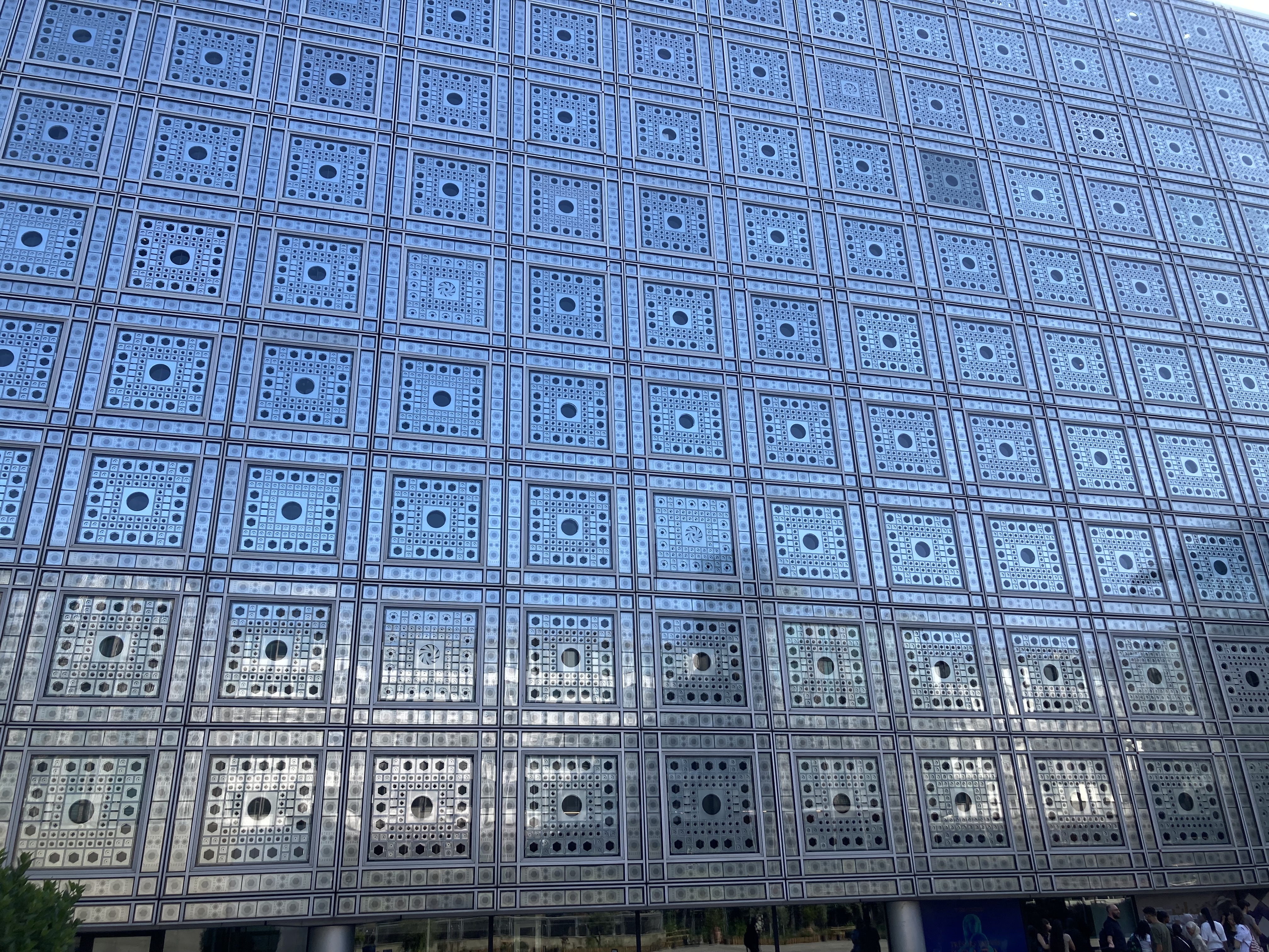 Uzaktan bakınca hem Arap kafesleri algılanıyor, hem de göz bebeğini andıran bu motiflerin içindeki mekanik mercekler otomatik olarak açılıp kapanabiliyor. İçeriden bakınca camların arkasında hareketli geometrik motiflere sahip metalik bir ekran görülebiliyor. Motiflerin hareketi 240 adet foto-hassas merceğin kontrol ettiği bir motor sistemi sayesinde gerçekleşiyor. Böylece bu açıklıklar veya panjurlar binaya güneşten gelen ışık ve ısı miktarına bağlı olarak fotoelektrik özelliğiyle büyüyüp küçülebiliyor ve iç aydınlatmayı da kontrol ediyor. Bu iklim odaklı mekanizma ile, İslam mimarisi tarzı filtrelenmiş ışıkla yaratılmış, yine iklim odaklı iç mekanlara gönderme yapılmış. Bu sayede teknolojinin hem yenilikçi hem de Arap kültürüne gönderme yapan kullanımı ve binanın tasarımının başarısı Nouvel'i üne kavuşturmakla kalmamış, müzeyi Paris'in kültürel referans noktalarından biri haline getirmiş.