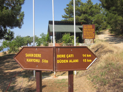 Bir hayli tahrip edilmiş(?) Türkmen Mezarlığı ile inişe başlıyor, görmemekle birlikte homurtularını işittiğimiz yabandomuzlarının eşliğinde Dereçatı’ya varıyoruz. Şelalenin “büvet” denilen 3 m. kadar derinlikteki “dere gölcükleri”, serinlemek isteyenlerin emrine amade. Dereçatı Tarlası adlı kesimde, ağaçlara “foto-kapan” yerleştirip, yabani hayvanların görüntülerini yakalamayı amaçlayan “orman yetkilileri” ile söyleşip birlikte su ve çay içiyoruz. Aktaş yöresinde 960 m. yükseklikten Şahinderesi Kanyonu’nu tüm haşmetiyle izliyor, fotoğraflıyoruz. Ağlayan Çam yolundan, tekrar parkurumuzun başladığı Kışladağı girişi ile birleşiyoruz. Her dönemeçte “Zeytin Denizi”nin ve “Edremit Körfezi”nin bir başka görüntü sürprizi ile karşılaşarak Avcılar Köyü’ne iniyor, köy kahvesinde içtiğimiz ayranlarla Mehmet Yılmaz’a teşekkür ve veda ederek safarimizi sonlandırıyoruz.