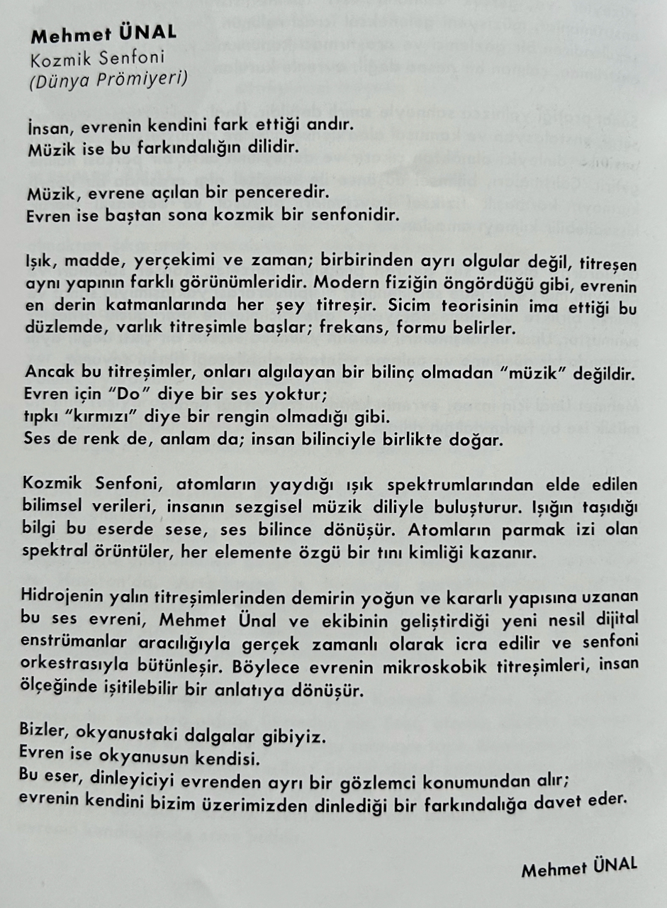Bu anımsatmayı, 13 Şubat 2026 akşamı şef Cemi’i Can Deliorman’ın yönettiği Cumhurbaşkanlığı Senfoni Orkestrası eşliğinde dünyada ilk seslendirilişi yapılan Mehmet Ünal’ın Kozmik Senfoni başlıklı yapıtı hakkında yazmaya başlamadan önce yapma gereğini hissettim. Çünkü müziği merak eden, genç, ancak yakın müzik tarihimiz hakkında yeterli bilgisi olmayan bir dinleyici kitlesi var.