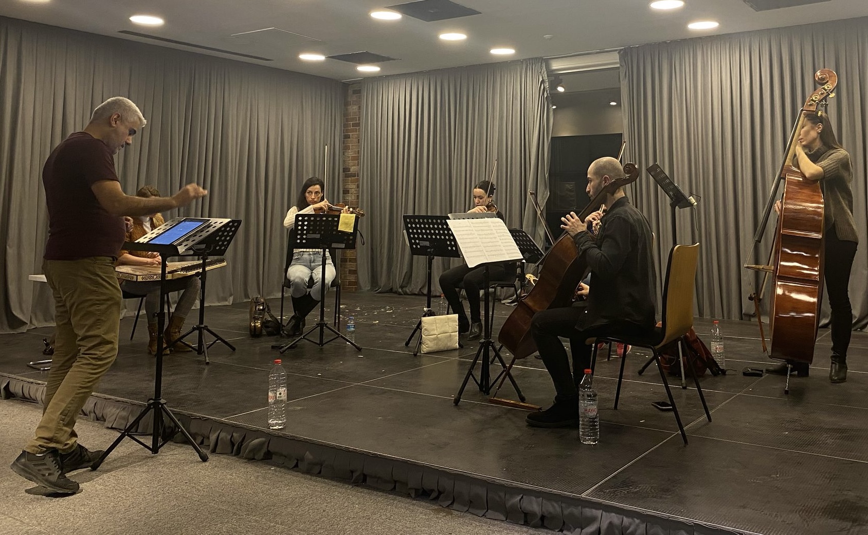 Özkoç Sanatçı Kolektifi’nde yer alan kadroya baktığımda, hemen Alnar çağrışımı geldi aklıma. Çünkü Alnar, günümüzde oda orkestrası eşliğinde seslendirilen konçertosunu ilk olarak yaylı beşli eşliği ile yazmıştı. Özkoç da 2017’de yazdığı konçertosunda solo kanuna eşlik olarak yaylı beşliyi seçmişti. Solo kanunda Esra Berkman, yaylı beşlide Ceren Türkmenoğlu ile Tanay Totuk (keman), Tuğçe Baydar (viyola), Hakan Hürkan Şahin (viyolonsel) ve Gizem Sözeri (kontrbas) yer alıyor.