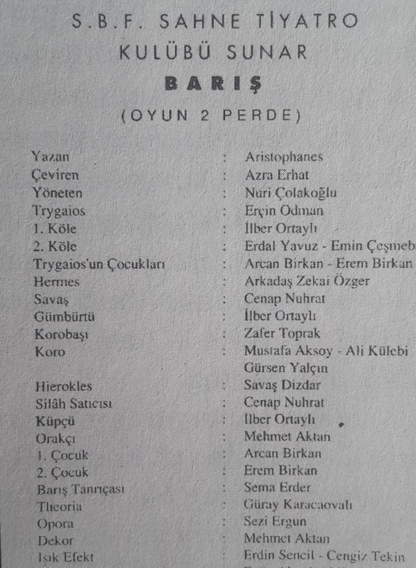 Yine de öğrencilik yıllarında Aristophanes’in Barış adlı oyununda rol üstlenmişti. On yıldır süren Peloponez Savaşı'nı sona erdirecek olan Nicias Barış Antlaşması'nın onaylanmasından sadece birkaç gün önce ilk kez sahnelenmiş olan eseri bu kez Siyasal Bilgiler Fakültesi Tiyatro Kulübü izleyiciyle buluşturuyordu. Yönetmen okul arkadaşlarından Nuri Çolakoğlu idi. Ortaylı birinci köle rolündeydi, ikinci köle ise birkaç yıl önce kaybettiğimiz ODTÜ Ekonomi Bölüm Başkanlarından Erdal Yavuz’du. Oyunun korosunun başında yine yakında yitirdiğimiz tarih Profesörü Zafer Toprak vardı. Hermes rolündeki şair Arkadaş Zekai Özger ise çok önce yaşama veda etmişti.