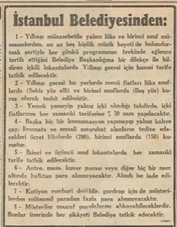 Buna göre, “yalnız lüks ve birinci sınıf müesseseler” beş kişilik müzik heyeti bulundurmak şartıyla, Belediyeden izin alarak yılbaşı gecesi için özel fiyat tarifesi uygulayabileceklerdi. Bu durumda kişi başına fiyat lüks yerlerde 8 lirayı, birinci sınıf yerlerde de 5 lirayı geçemeyecekti. İçki fiyatları ise normal günlerdekinin yüzde 30’undan fazla olamayacaktı. Diğer lokantalarda her zamanki fiyat uygulanacaktı.
