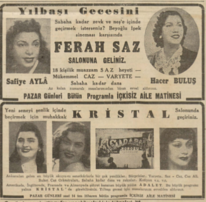 İstanbul’un tanınmış gazinosu Kristal’de de zengin bir program gerçekleşecekti. Gazino, numara verdiği masaların önceden ayırtılabileceğini ve caz orkestrasının da sahnede olacağını ilanlarda duyurmayı ihmal etmemişti.