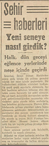İkinci Dünya Savaşının ardından kutlanan ilk yılbaşı gecesini “Şehir İkinci Dünya Harbinden sonra sulh içinde ilk yılbaşı gecesini büyük bir neşe içinde geçirmiştir” sözcükleriyle başlayan haberle okurlara aktarılmıştı.